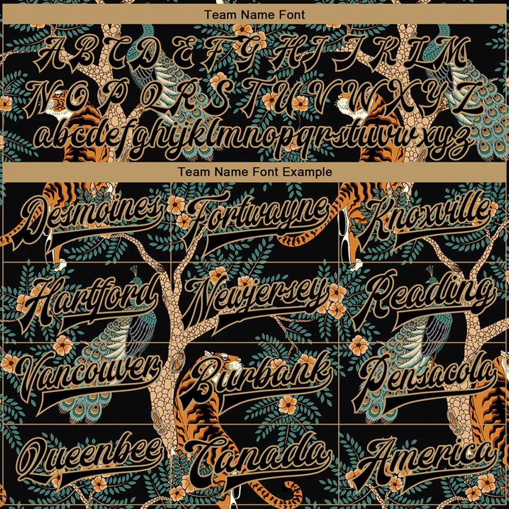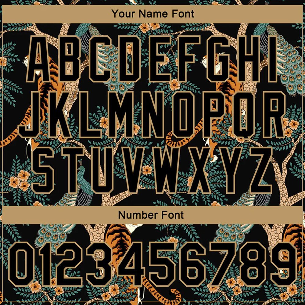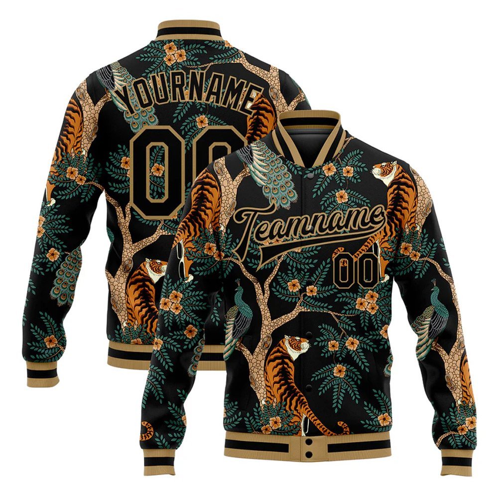 Custom Black Black-Old Gold Tiger And Peacock 3D Pattern Design Bomber Full-Snap Varsity Letterman Jacket