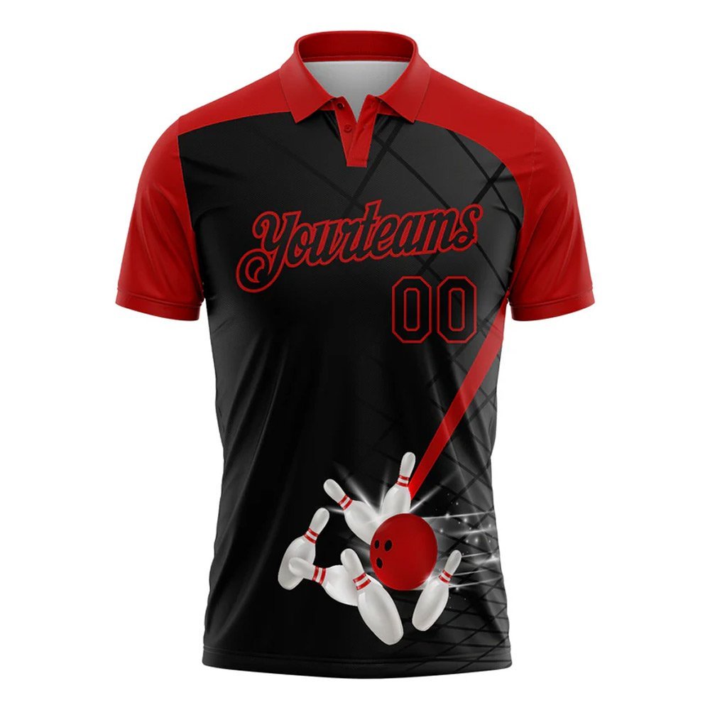 Custom Black Red 3D Pattern Design Bowling Performance Polo Shirt