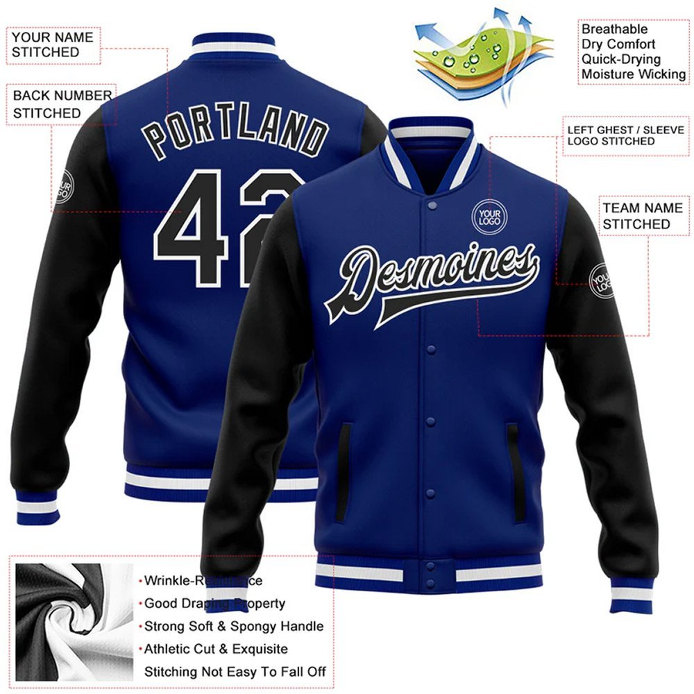 Custom Royal Black-White Bomber Full-Snap Varsity Letterman Two Tone Jacket